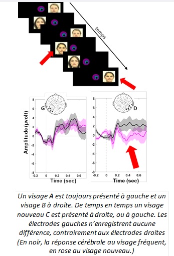 que leur regard était attiré au centre. De temps en temps un visage nouveau était présenté soit à droite, soit à gauche. Le cerveau des bébés, plus précisément leur hémisphère droit, ne discriminait que les visages présentés dans leur champ de vision gauche. En utilisant l’imagerie par résonance magnétique, les chercheurs ont aussi montré que la vitesse des réponses cérébrales augmentait avec la maturation des fibres nerveuses connectant les régions visuelles des deux hémisphères. Néanmoins cette maturation n’est pas encore suffisamment efficace pour que l’hémisphère droit prenne le relais de l’hémisphère gauche « incompétent » pour reconnaître les visages présentés à droite. Ces résultats mettent en évidence d’importantes différences fonctionnelles entre hémisphères cérébraux qui seraient a priori établies dès la naissance. Ils soulignent l’extrême organisation cérébrale du bébé humain dans les premiers mois de vie, bien loin du concept d’une argile modelée par l’environnement.